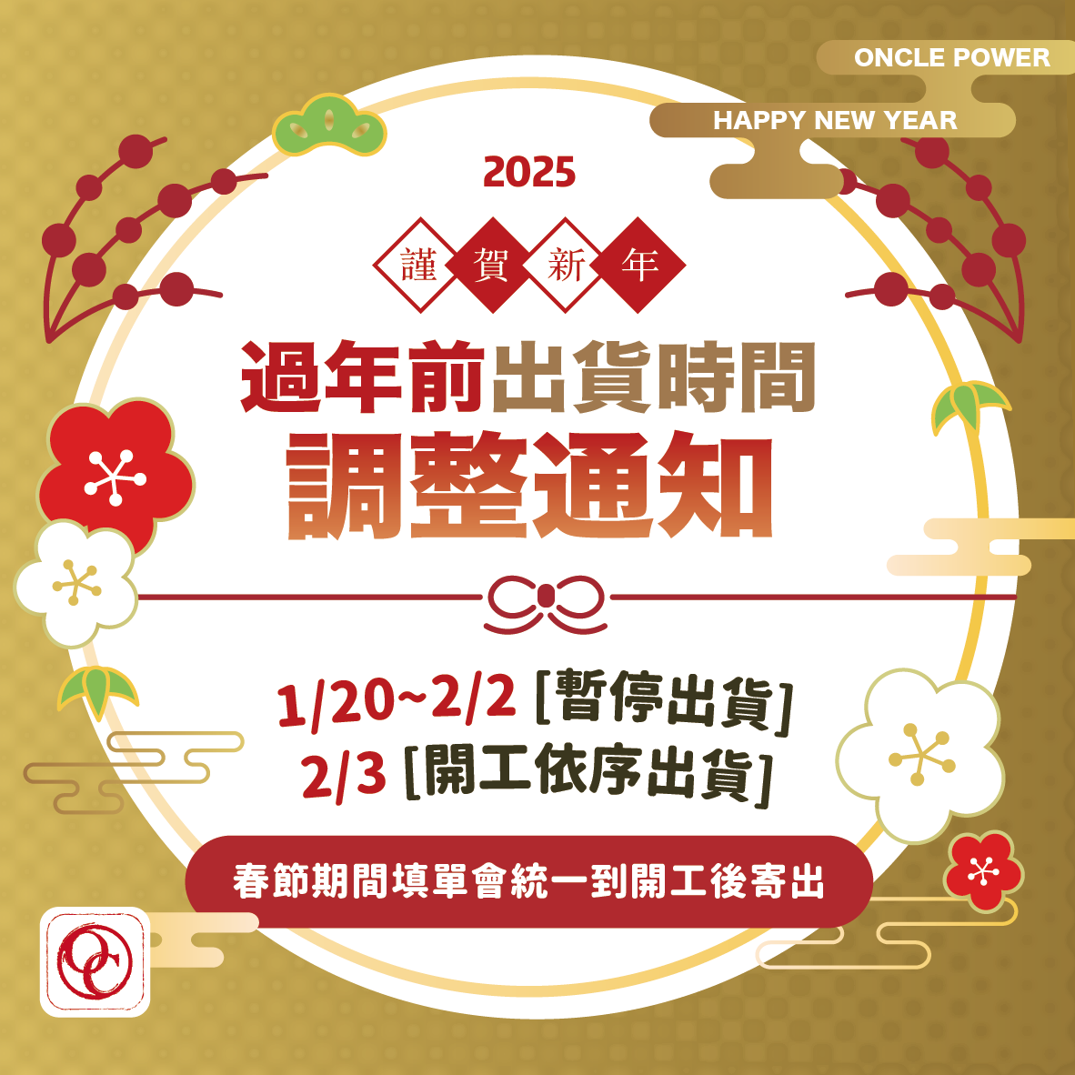蛇年出貨時間調整通知 2/3開工依序出貨